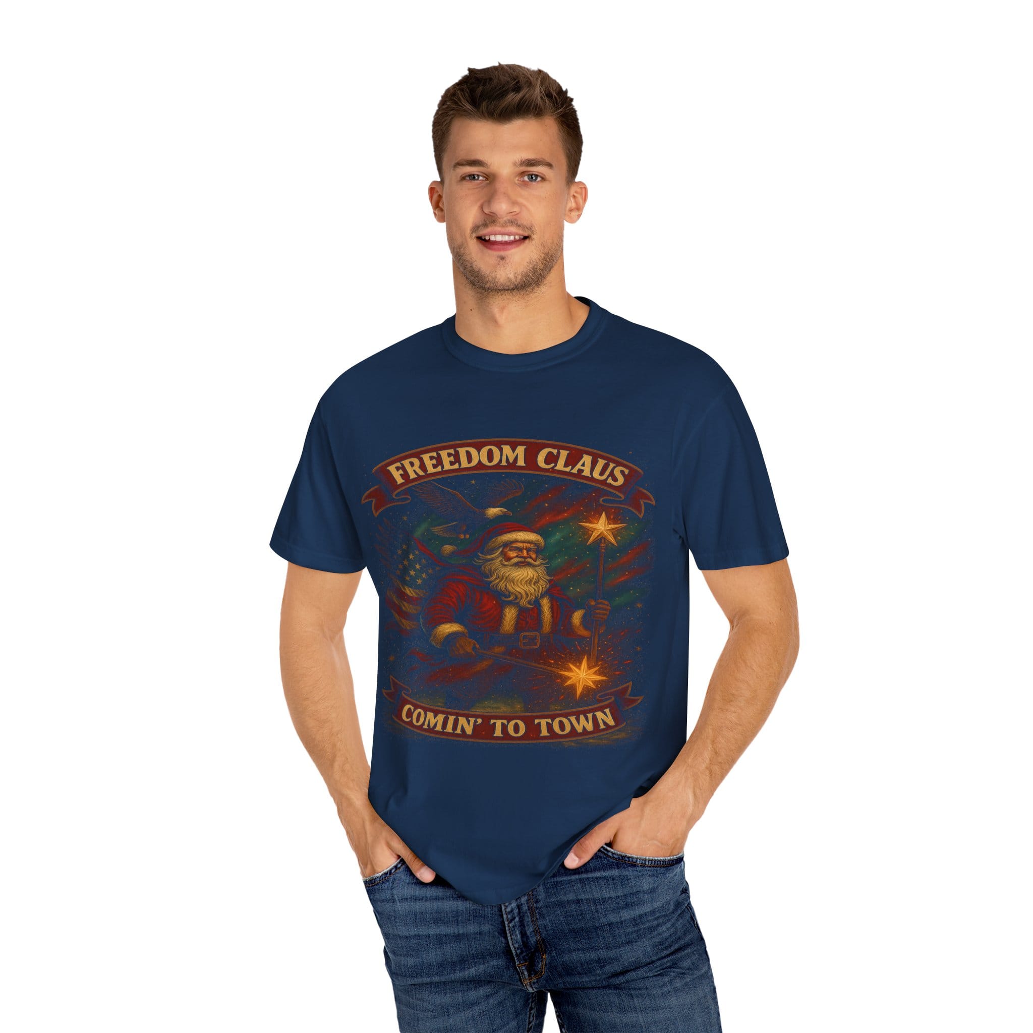 Freedom Claus T-Shirt with a vintage Santa graphic, giving a festive and nostalgic vibe. Perfect for those who love unique holiday tees and want to stand out during the Christmas season. Great for casual wear or holiday gatherings.