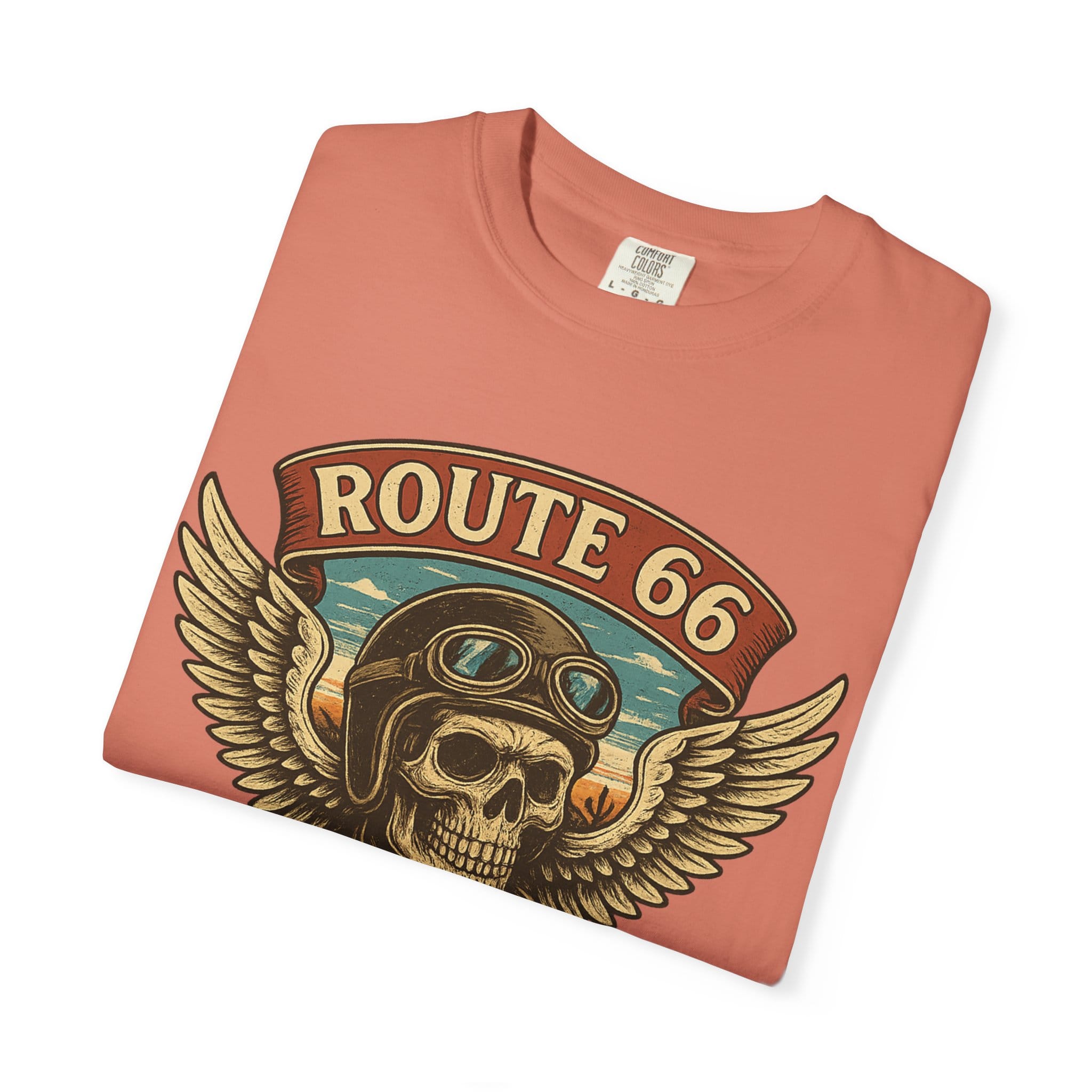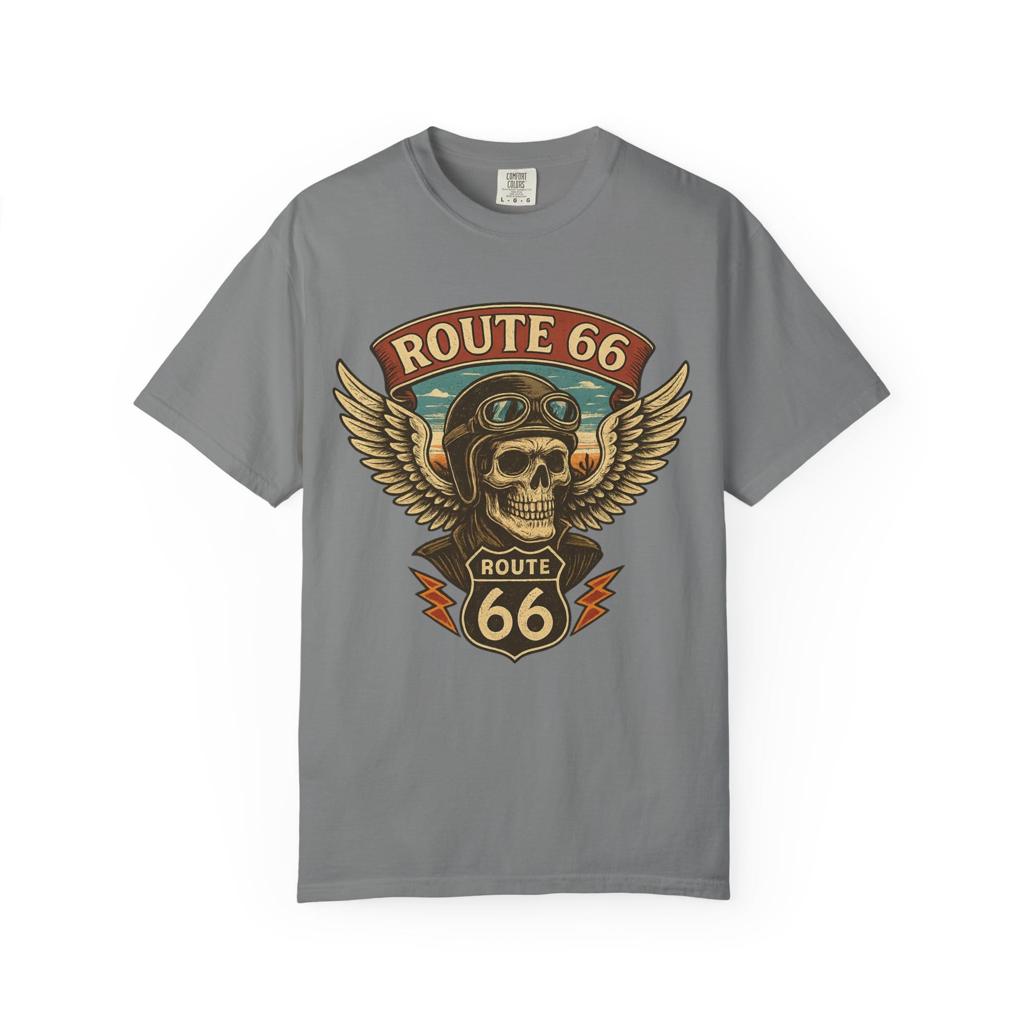 Vintage biker vibes with this Route 66 Skull Motorcycle T-shirt featuring wings and a helmet. Perfect for motorcycle enthusiasts and those who love the open road. Great for biker rallies, motorcycle meetups, and casual everyday wear.
