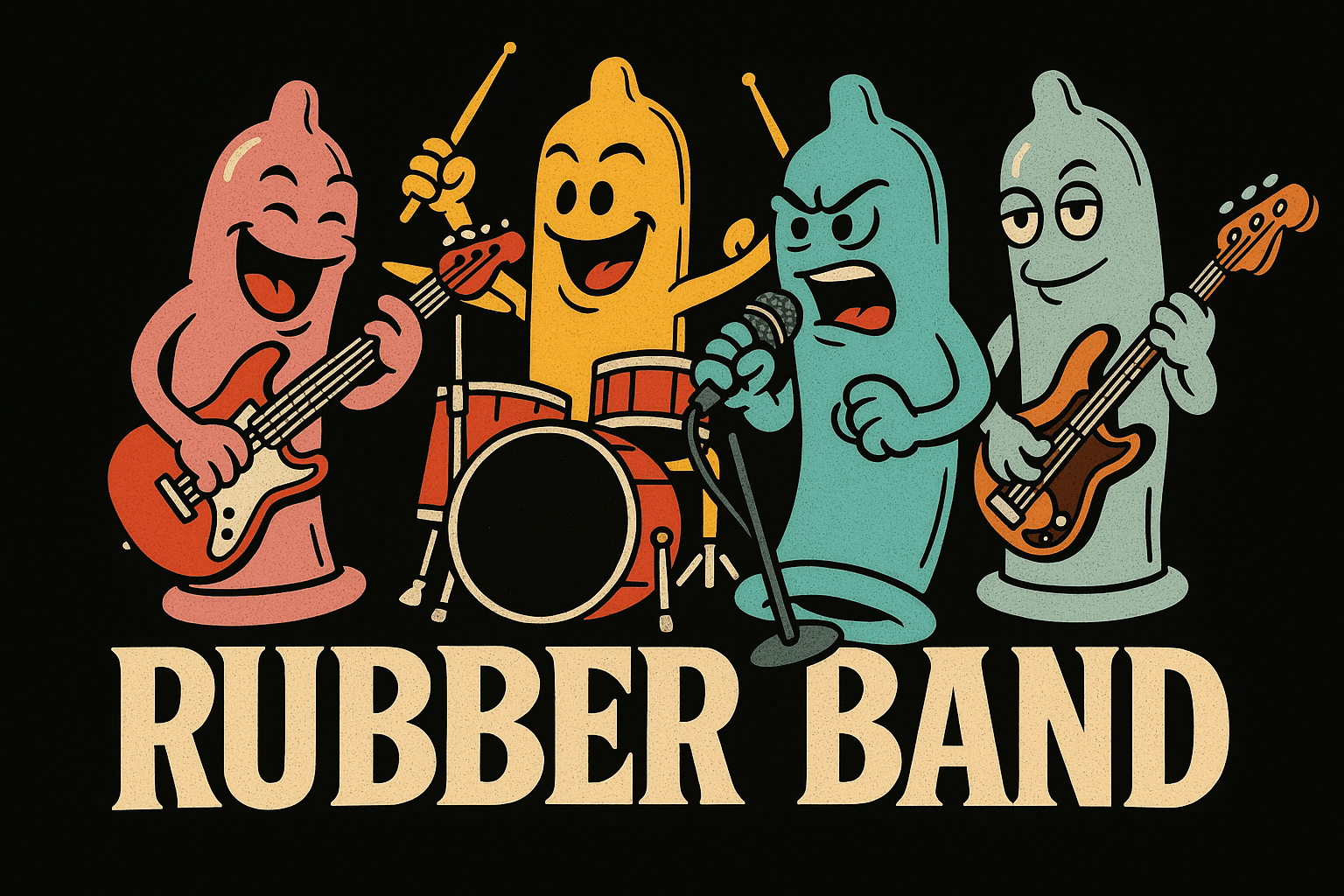Forget your dad’s lame “World’s Best Grandpa” T-shirt—this is the one that’ll make strangers spit beer out their noses. The Rubber Band is four wild latex lunatics tearing up the stage like your last condom wrapper on prom night.