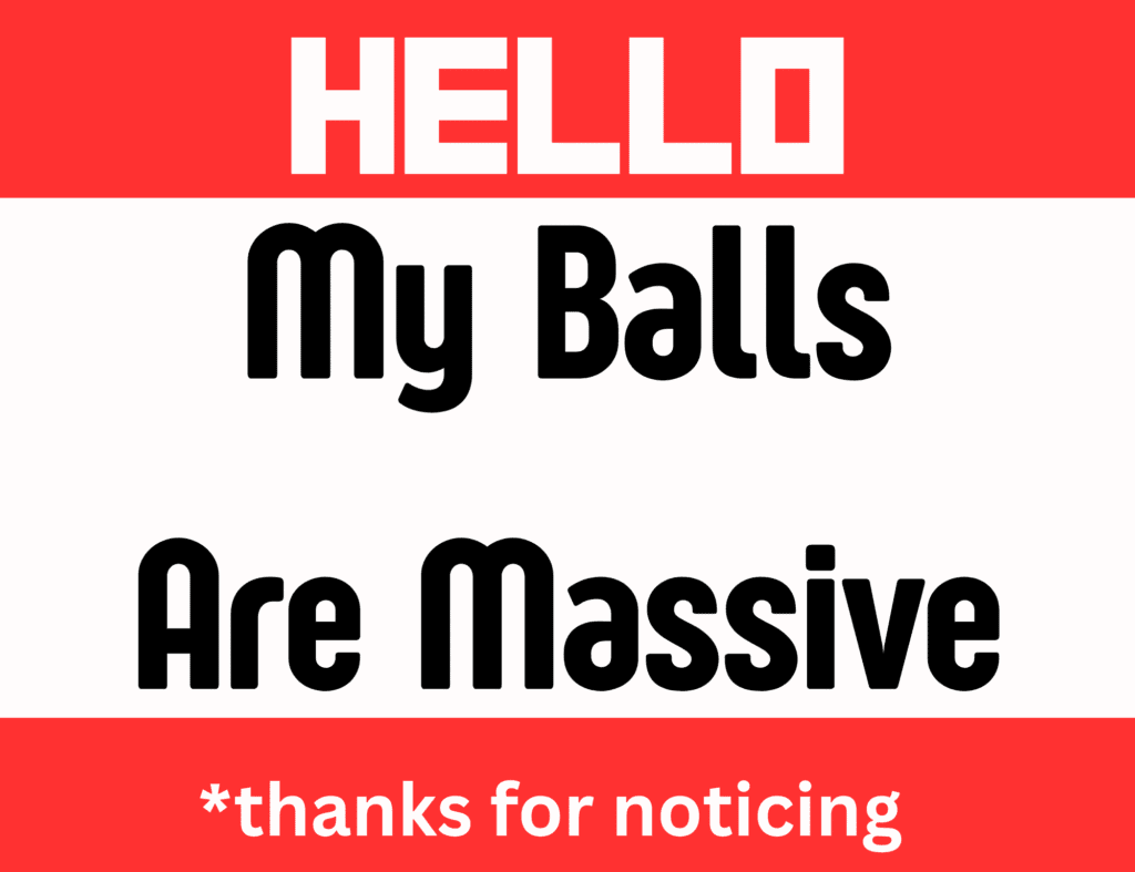 Turn heads and drop jaws with this outrageous twist on the classic name tag. Our ‘Hello, My Balls Are Massive!’ design is a bold, cheeky statement for anyone who lives life loud and loves a good laugh. Perfect for parties, gag gifts, or just letting the world know you’ve got confidence to spare.